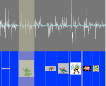 The selection shows the portion of the sound wave where the story is speaking about a green animated figure. It shows the green animated figure attached to that portion of the sound wave. To attach a picture in this way, simply select the appropriate portion of the sound wave, click on the icon with the picture of camera on the ACORNS toolbar(The top toolbar, not the secondary toobar in the lesson setup panel). Use the file dialog box to find the picture you want to attach. There are ACORNS help pages that describe inserting pictures in more detail should the above description be insufficient.