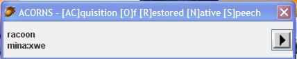 If you wish to hear the recorded sounds attached to places on the picture, simply click on any of the acorns. ACORNS will randomly play the audio for one of the sounds attached to the acorn. You will also see a pop-up window (shown below) containing the gloss translation (Normally English) and the native spelling associated with the audio. Note the arrow to the right of the dialog. You can click this should you want to rehear the audio.
