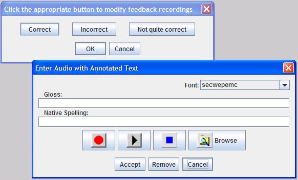 After clicking the button of choice, a dialog appears, also shown in the picture below. This is the exact same dialog we use to manually enter recordings for many of the lesson types. You you can find more information related to this dialog by referring to the Recording and Maintaining Audio page.