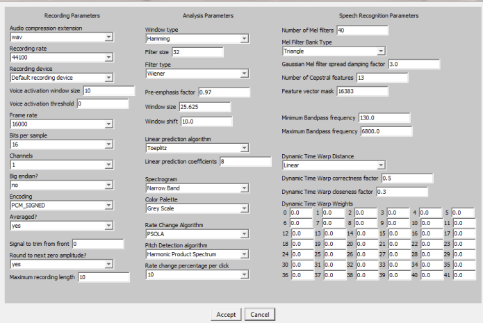 Dynamic Time Warp parameters These parameters determine how ACORNS will compare two audio signals to determine whether they match. We advise that you leave these values alone.